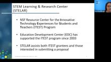 The National Science Foundation’s Innovative Technology Experiences for Students and Teachers (ITEST) Program supports applied research and development focused on increasing preK-12 students' interest in careers in information and communication technology and STEM through innovative technology-based learning experiences. As the resource center for the NSF ITEST Program, STELAR is charged with supporting prospective PIs in developing competitive proposals.